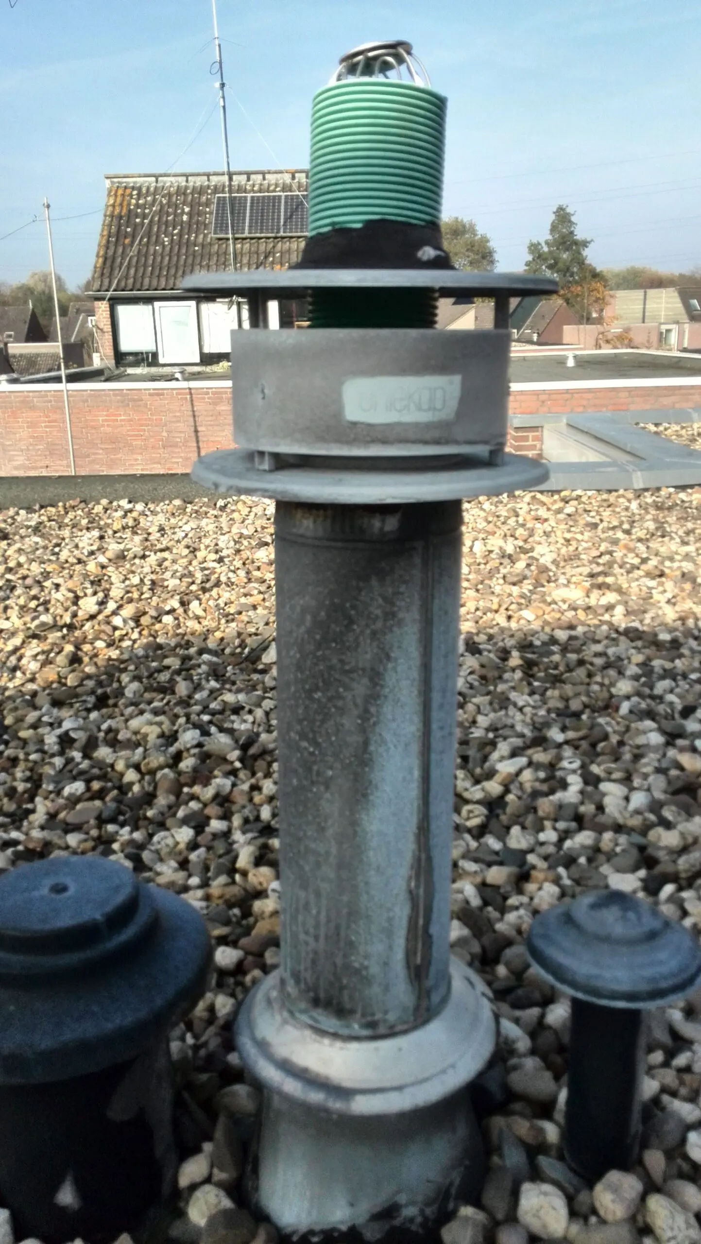 De renovatie van de rookgasafvoer met flexibel kunststof is bijna helemaal goed uitgevoerd. De installateur verzuimde echter de dakdoorvoer te vervangen, en kwam met deze oplossing door de bestaande monding. Lekkage bij de HR-ketel bracht het euvel aan het licht.