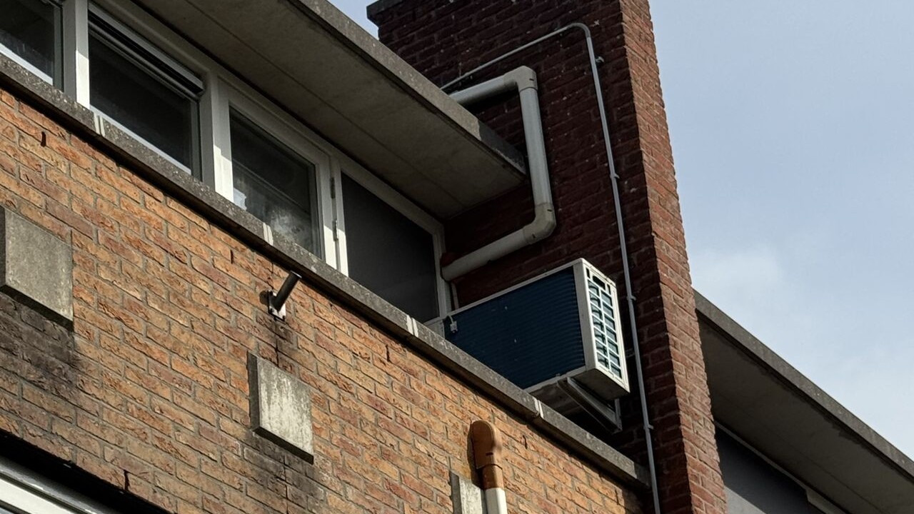 Soms kijk je met verbazing omhoog. Dat is hier zeker het geval. De airco staat namelijk verkeerd om op de muurbeugels. Dat heeft waarschijnlijk een estetische reden, of de bewoner vind het irritant dat het waait op het balkon. Feit is dat de benodigde vrije uitblaas door de muur niet mogelijk is, en dat ga je merken in de prestatie. Voordeel is wel dat de aansluitingen nu aan de veilige zijde van het balkon zitten, en dat de lamellen goed bereikbaar zijn voor het onderhoud. Dat dan weer wel.