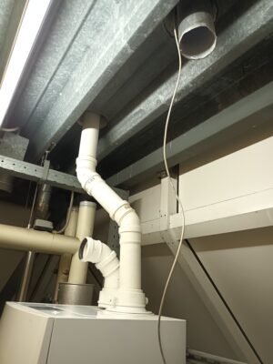 Soms wordt er maar wat makkelijk aangerommeld. In dit utiliteitspand is niet veel energie gestoken in het fatsoenlijk aansluiten van de rookgasafvoer en luchttoevoer. De luchttoevoer komt wel uit de technische ruimte onder het dak. De…