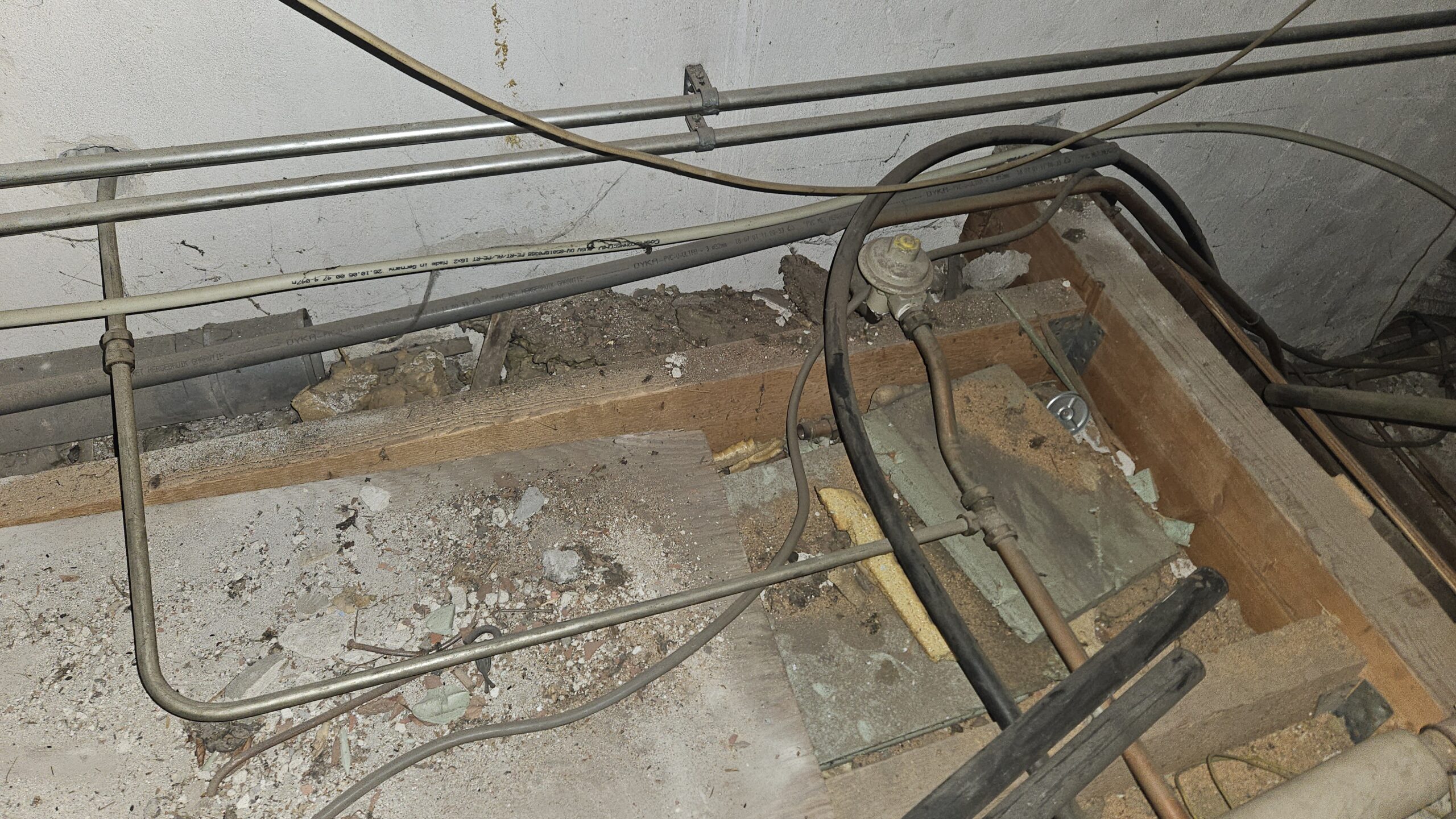 De monteur die bij de een ander appartement van dezelfde verhuurder de rookgasafvoer ging vervangen, trof bij de ketel een gasleiding aan van dunwandig cv-materiaal (15 mm). Het betreft een pand met diverse huur appartementen, afspraak is gemaakt met de bewoner van het appartement waar de dunwandige leiding naartoe gaat om het te herstellen. Eenmaal binnen bij de buren, treft hij bij de gasaanvoer nog wat anders tegen. Een waterafsluiter met een aftapkraantje, in de gasleiding. Het gedeelte in de muur is ook nog een door roest en deuken beschadigd. De hele leiding is vervangen door een nieuwe koperen leiding met mantelbuis.