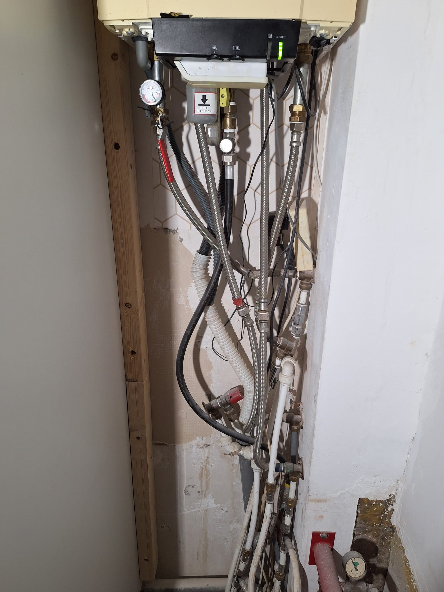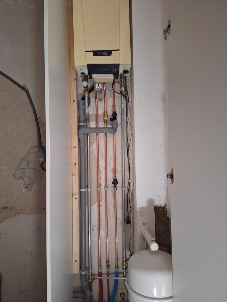 Dit stukje ellende trof de badkamerinstallateur aan bij de renovatie van een (gelukkig) leegstaand pand. Hoewel het niet bij zijn klus hoorde, viel zijn oog er uiteraard wel op. Het toestel is direct door hem uit bedrijf genomen. Een dramatische spaghetti van ondeugdelijke koppelingen, een gasfornuis slang als gasleiding, flexibele aansluitslangen en inferieure materialen. Al het cv-werk is 16 mm. Het goede nieuws is: de hele handel is eruit gehaald, en dat kunnen we showen.