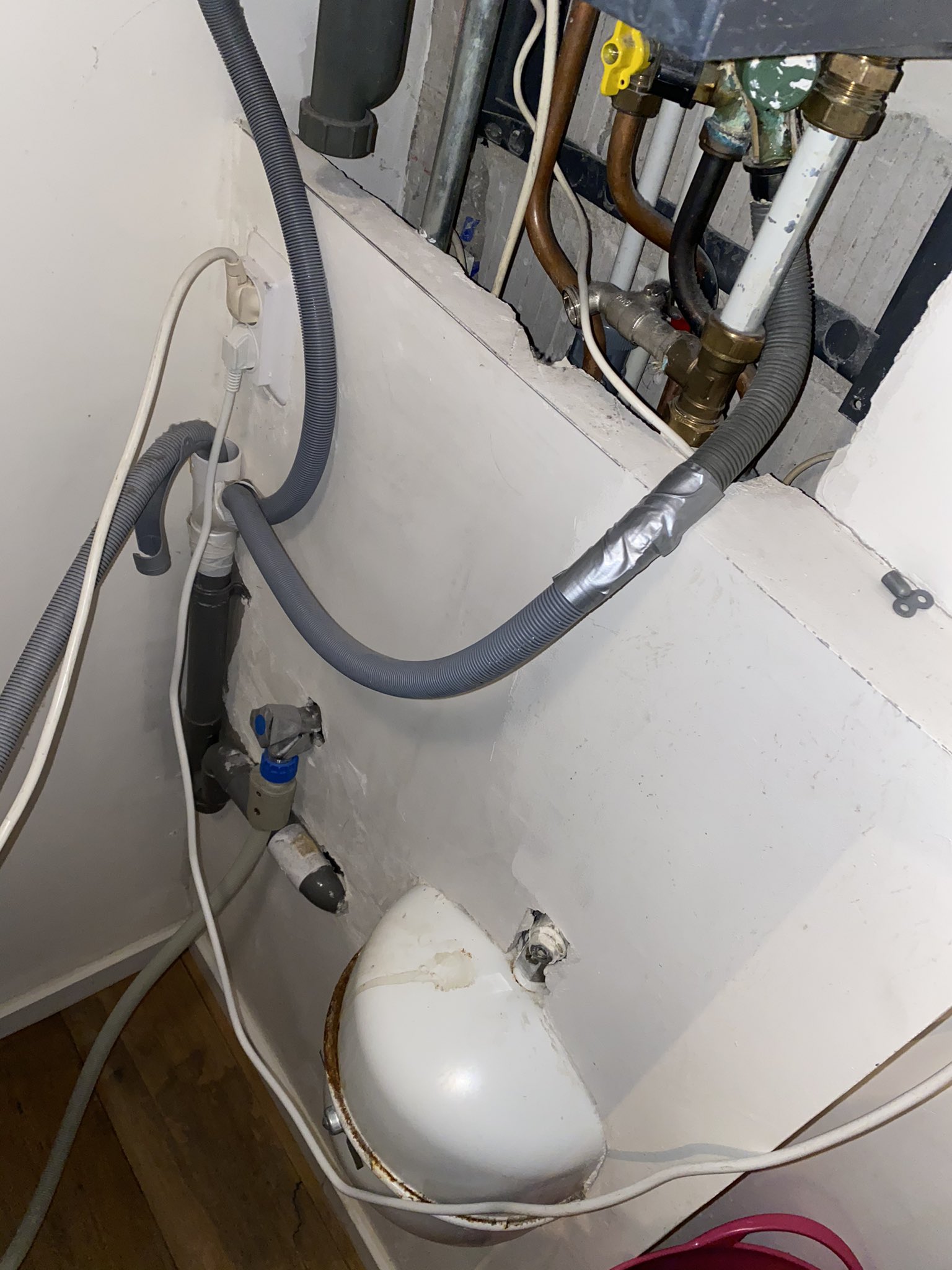 Een deel van het installatiewerk is met de Franse slag weggewerkt achter een aangesmeerd wandje. Het expansievat bolt nog half uit de muur. Wanneer deze vervangen moet worden moet de monteur eerst aan het slopen. Op deze manier maken we het niet makkelijker voor elkaar. Als je het dan al weg wilt werken, doe dat met een demontabel voorzetwandje. De onderhoudsmonteur zal je dankbaar zijn.