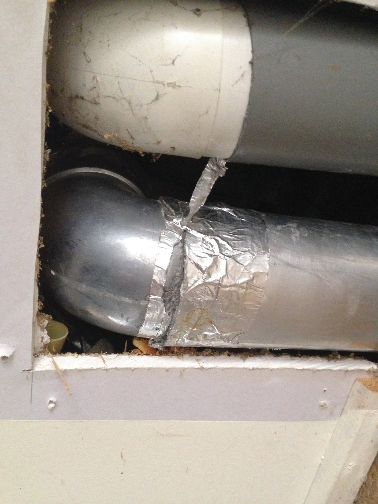 Lekkage in het plafond. De opgetrommelde installateur zaagt een gat en treft een ongebeugelde rookgasafvoer die met plakband aan elkaar is gemonteerd en condenswater lekt: afschot en montagewijze deugen niet.