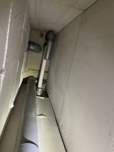 Een blik in de schacht van een appartementencomplex. Hier is bij de renovatie een 60 mm flexibele rookgasafvoer horizontaal gemonteerd. Dat mag niet. De flexibele leiding is bedoeld als doorvoer in een schacht, niet als een…