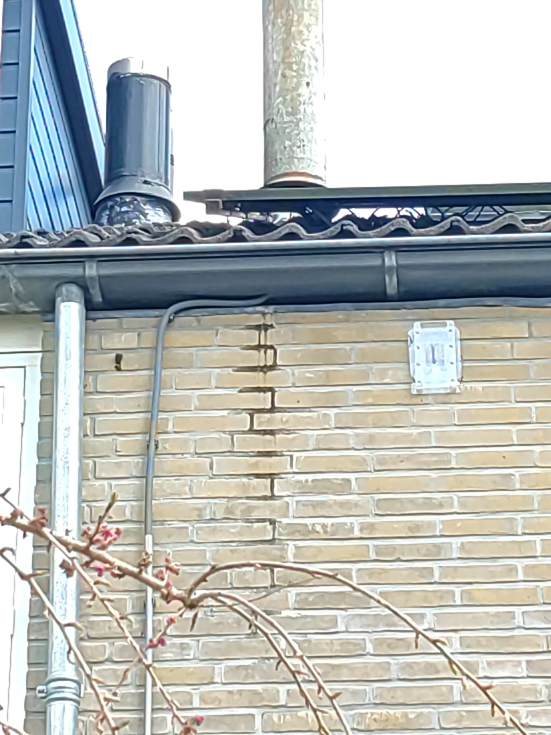 Dat gat zit hier in de dakgoot. Je ziet dat de goot nu lekt, want de muur wordt nat en verkleurt. De installatie zelf was volledig met behulp van een ladder uitgevoerd. De installateur is inmiddels failliet.