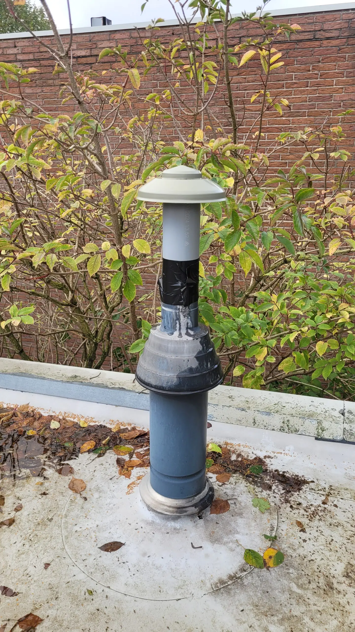 De installateur kwam voor een daklekkage, maar werd verrast door de rookgasafvoer. Hier is met verschillende materialen, niet geschikt voor rookgassen, een regenkapje geplaatst. Toegegeven : er komt geen regenwater meer in de rookgas en echt onveilig is het (nog) niet gebleken, maar zo hoort het simpelweg niet. Met een HR-ketel is een bovenkap foute boel: want dan krijg je recirculatie. Het advies is dan ook: aanpassen zoals het wél hoort.