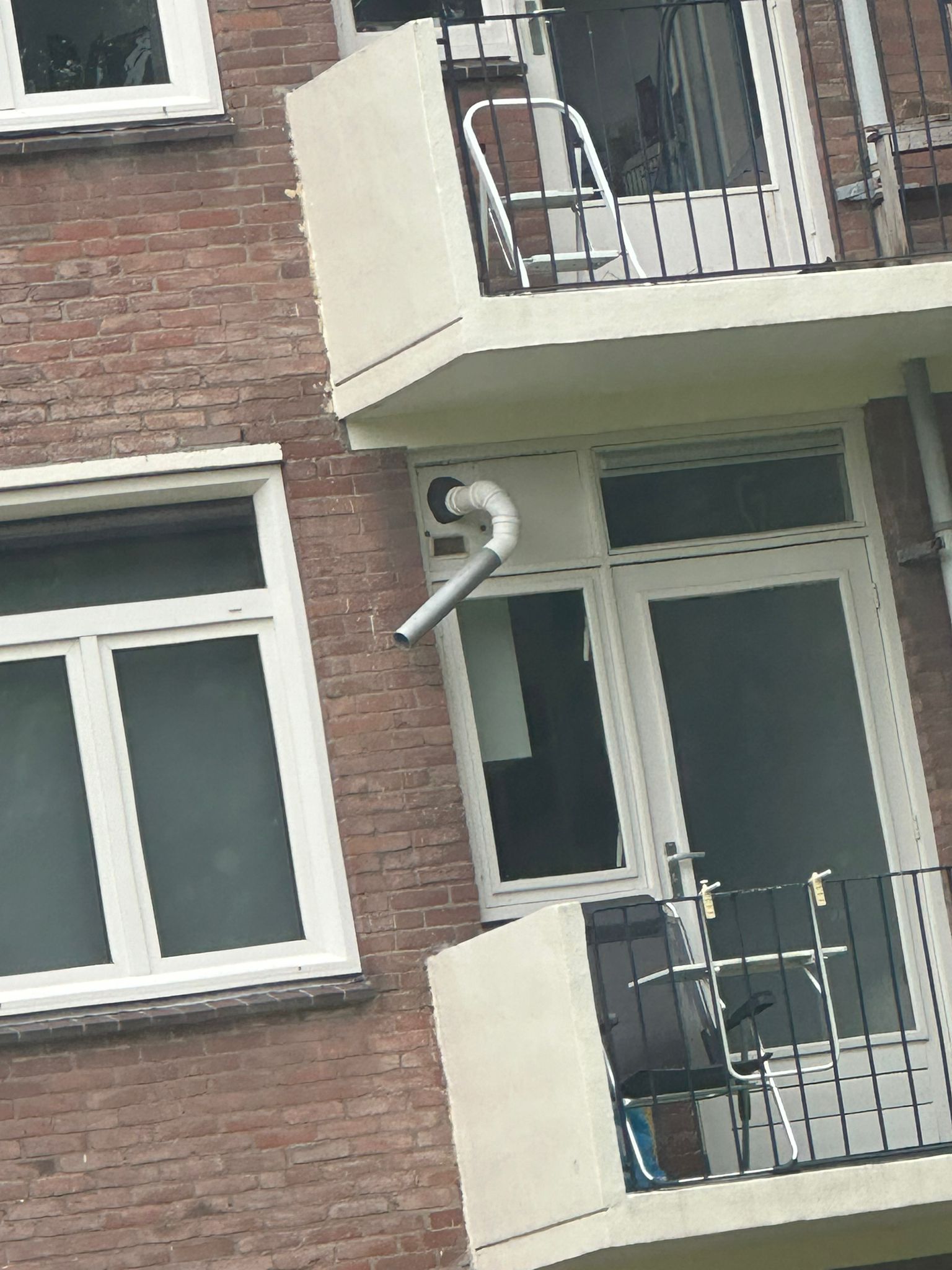 Als je op je balkonnetje zit, wil je natuurlijk niet in je eigen damp zitten. Bij deze flat heeft de bewoner, of een andere handige rakker, de rookgasafvoer afgebogen tot buiten het balkon. Foute boel natuurlijk, want het eigenhandig verlengen van rookgasafvoeren is niet toegestaan.
