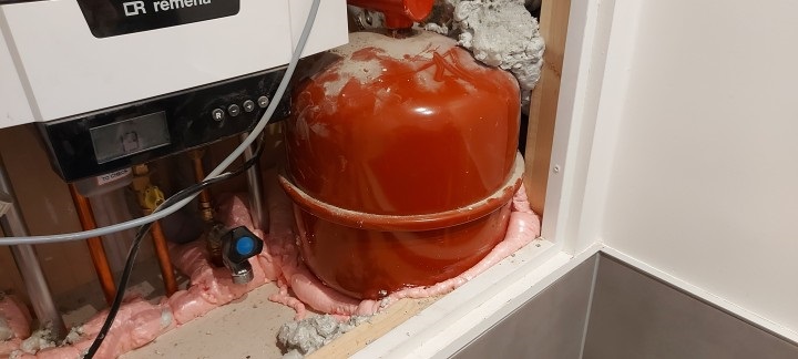 Het houdt al niet over qua ruimte bij deze cv-ketel. Maar doordat er nogal ijverig is geïsoleerd, is fatsoenlijk onderhoud überhaupt onmogelijk. Het expansievat, de appendages en zelfs de rookgasafvoer zijn ingepakt in het schuim. Dit is natuurlijk een afkeurenswaardige installatie bij het eerstvolgende onderhoud.