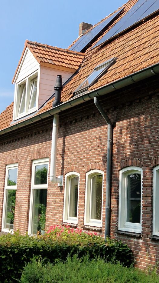 Deze voormalige geveldoorvoer is doorgetrokken tot boven de dakgoot. Op zich nobel, ware het niet dat deze hier voor een nieuw probleem kan zorgen: dat de rookgassen de woning weer in kunnen via het raamrooster of het dakraam. Misschien was het gewoon beter om de geveldoorvoer gewoon intact te laten. Wanneer de ramen alleen spuivoorzieningen zijn, is deze constructie overigens niet per definitie afkeuringswaardig. Maar eigenlijk heb je hier hetzelfde probleem gewoon verplaatst met een niet al te fraaie pijp.