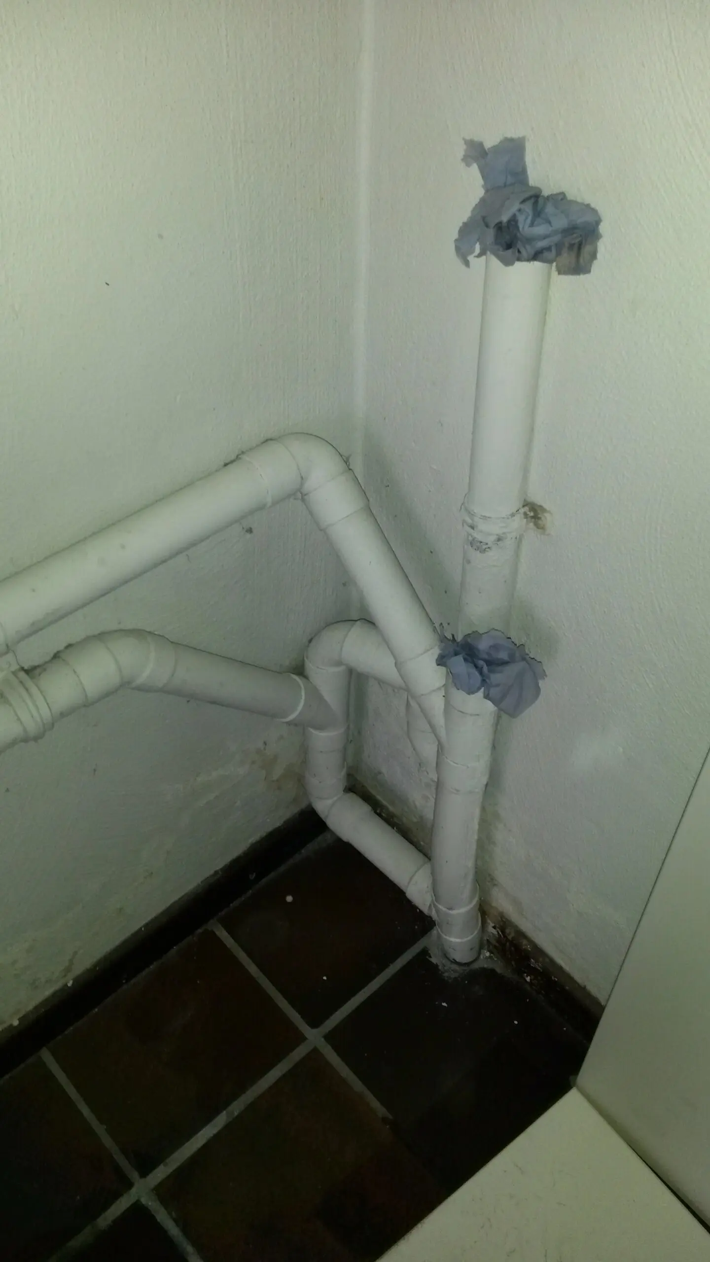 Een bijzonder knutselwerkje bij een wasmachine-aansluiting. De bovenste aansluiting is de later aangebrachte condensafvoer van de verwarmingsketel. De onderste buis is een ont/beluchtingsbuis die rechtstreeks door de muur naar buiten gaat.
