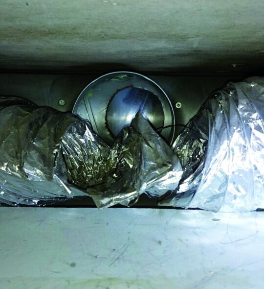 Bij het koken bleek het mechanische ventilatiesysteem beter te werken dan de afzuigkap voor het afzuigen van kookluchtjes. Een inspectie liet zien dat er van het flexibele afzuigkapkanaal weinig meer over was.