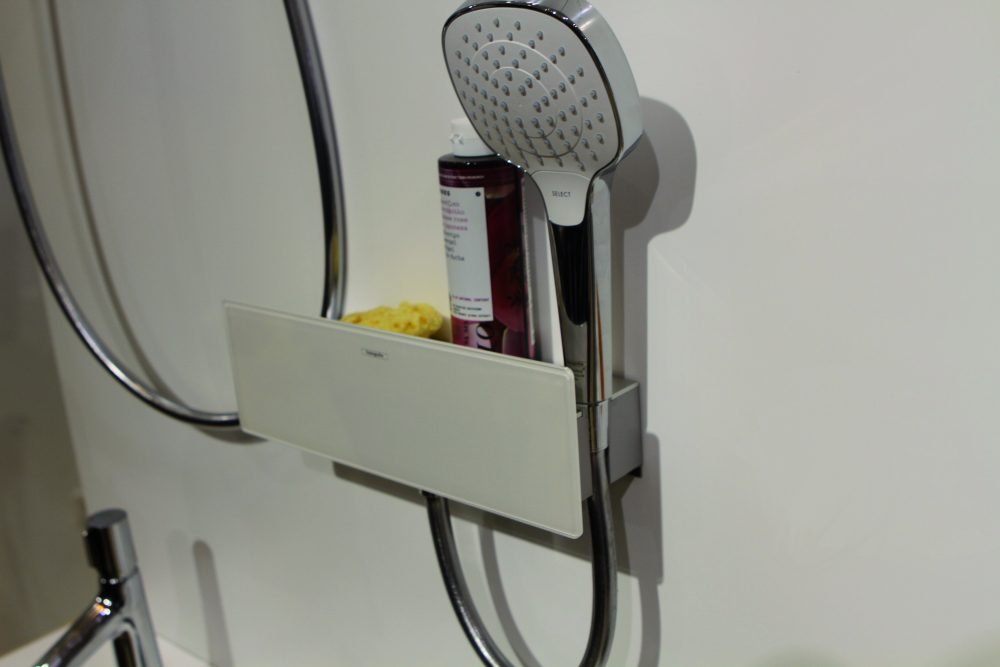 Hansgrohe introduceerde onlangs een nieuwe wandhouder-variant zien voor de Ecostat Select-thermostaat. De Fixfit Porter 300 combineert de bekende aflegplek en de afwerking met wit of helder veiligheidsglas, met een wandhouder en watertoevoer voor de handdouche. Bovendien is de wandhouder 7 cm naar links of rechts bij te stellen, ideaal voor wanneer bij renovatie een kraangat moet worden afgedekt.