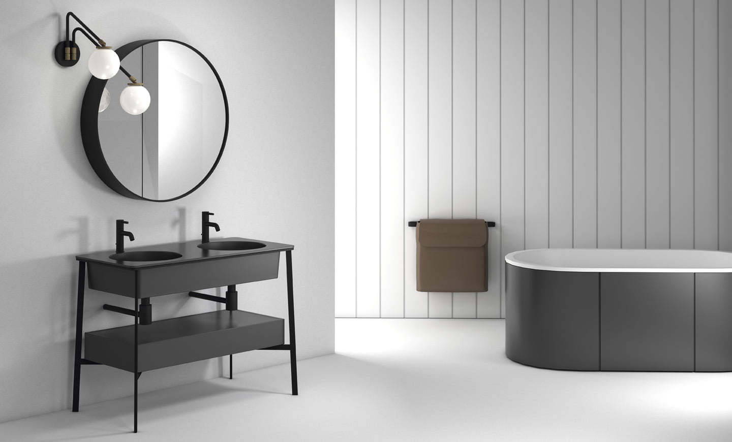 De keramische wastafel is verkrijgbaar in een ronde en een ovale vorm en als dubbele wastafel. De wastafel is gevat in een voet van staal, die naar keuze matzwart of geborsteld koperkleurig is. De wastafel zelf is verkrijgbaar in 16 kleuren. Bij de collectie horen twee bijpassende spiegelkasten, een ronde en ovalen, gemaakt van zwartgeverfd hout. Ook zijn er diverse bijpassende accessoires zoals een handdoekrek.