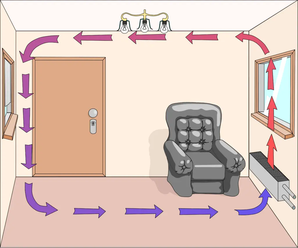 Daarnaast is het belangrijk dat er genoeg vrije ruimte rondom de verwarming. Meubels als banken en kasten voor de radiator blokkeren de convectiestroom. Gordijnen die tot op de vloer hangen houden warmte tegen en laten de warme lucht niet goed circuleren. Radiatorbekleding of een radiatorombouw kan de warmteafgifte beperken, tenzij er voldoende ventilatieopeningen zijn. Te weinig vrije ruimte boven of onder de radiator vermindert de convectie.